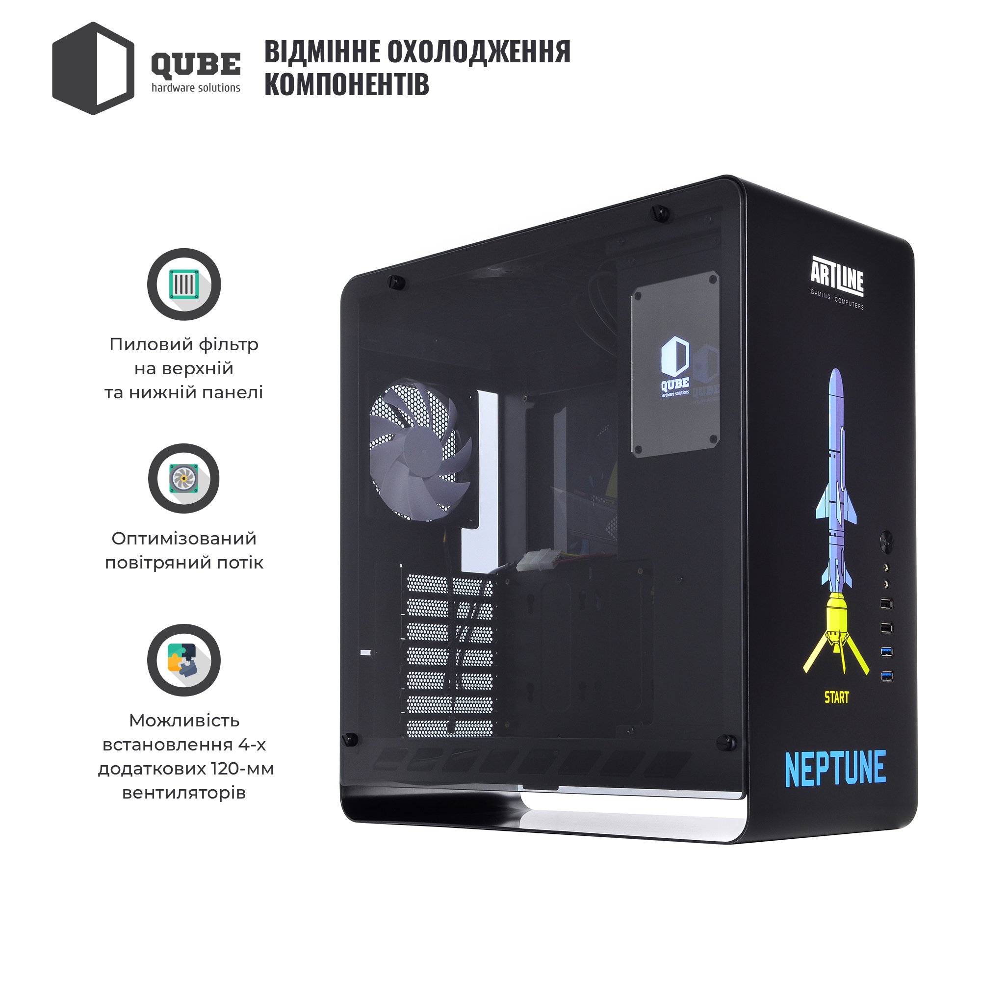 Из коробки корпус QUBE HAWK Neptune поставляется с одним 120 мм предустановленным вентилятором. Пользователь, по желанию, сможет дополнительно инсталлировать ещё 5 кулеров: снизу 2x120 мм, сверху 2x120 мм; сзади 1x120 мм. Благодаря продуманной внутренней конструкции воздушный поток от вращающихся вентиляторов будет способствовать оптимальному охлаждению установленных компонентов.
