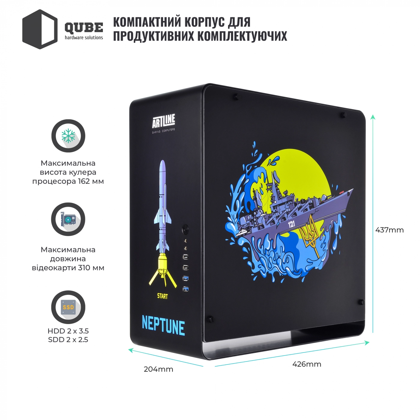 Модель QUBE HAWK Neptune – это просторный корпус формата MiddleTower, который удовлетворит требования подавляющего числа пользователей. Все острые края толстого листового металла толщиной 1 мм аккуратно зашлифованы или подогнуты, тем самым исключается любая возможность пораниться при сборке. Большое сервисное окно для установки или замены процессорного кулера, технологические окна для аккуратной разводки и монтажа кабелей, достаточный зазор за боковой крышкой – все это сделано для вашего удобства. Боковая панель выполнена из тонированного закалённого стекла.