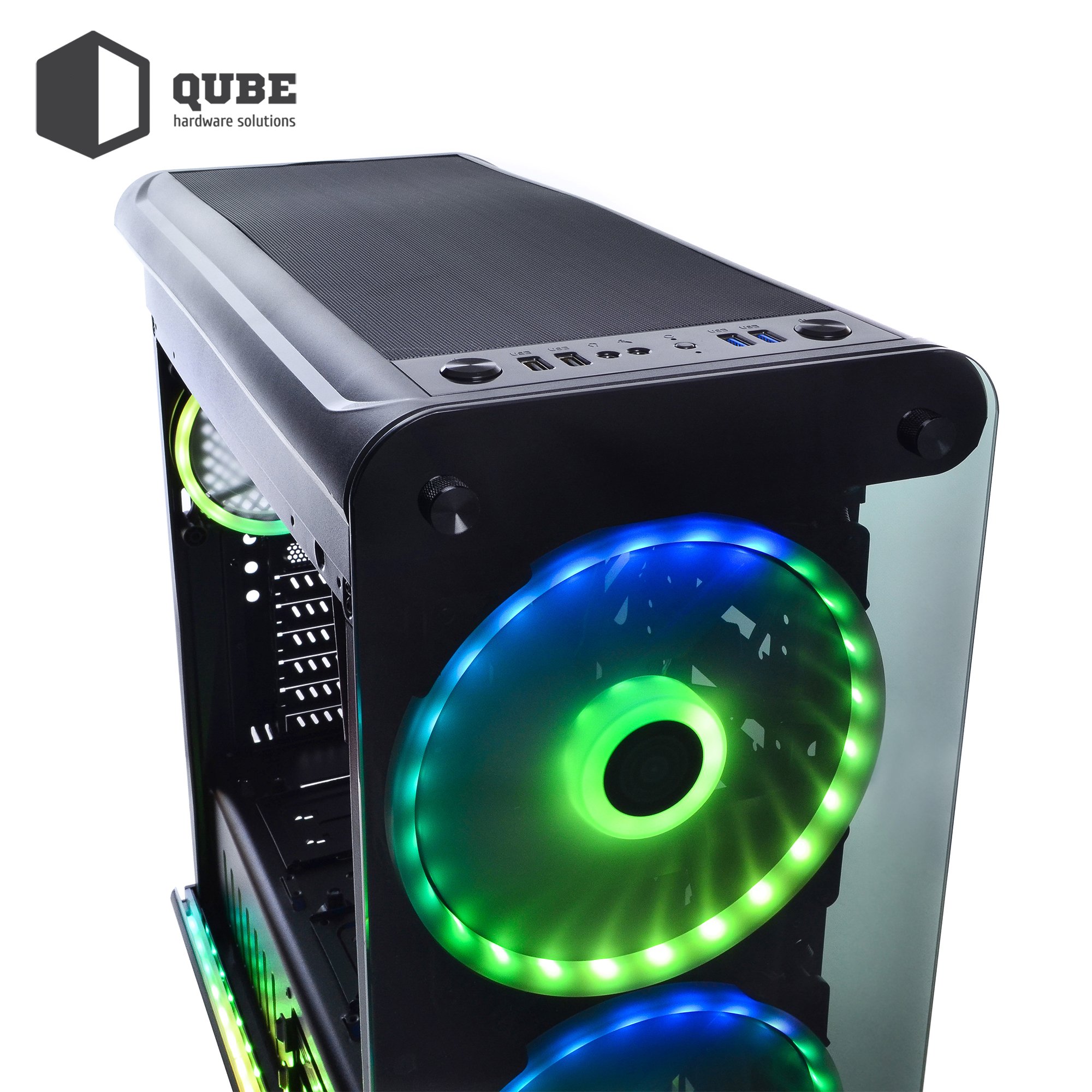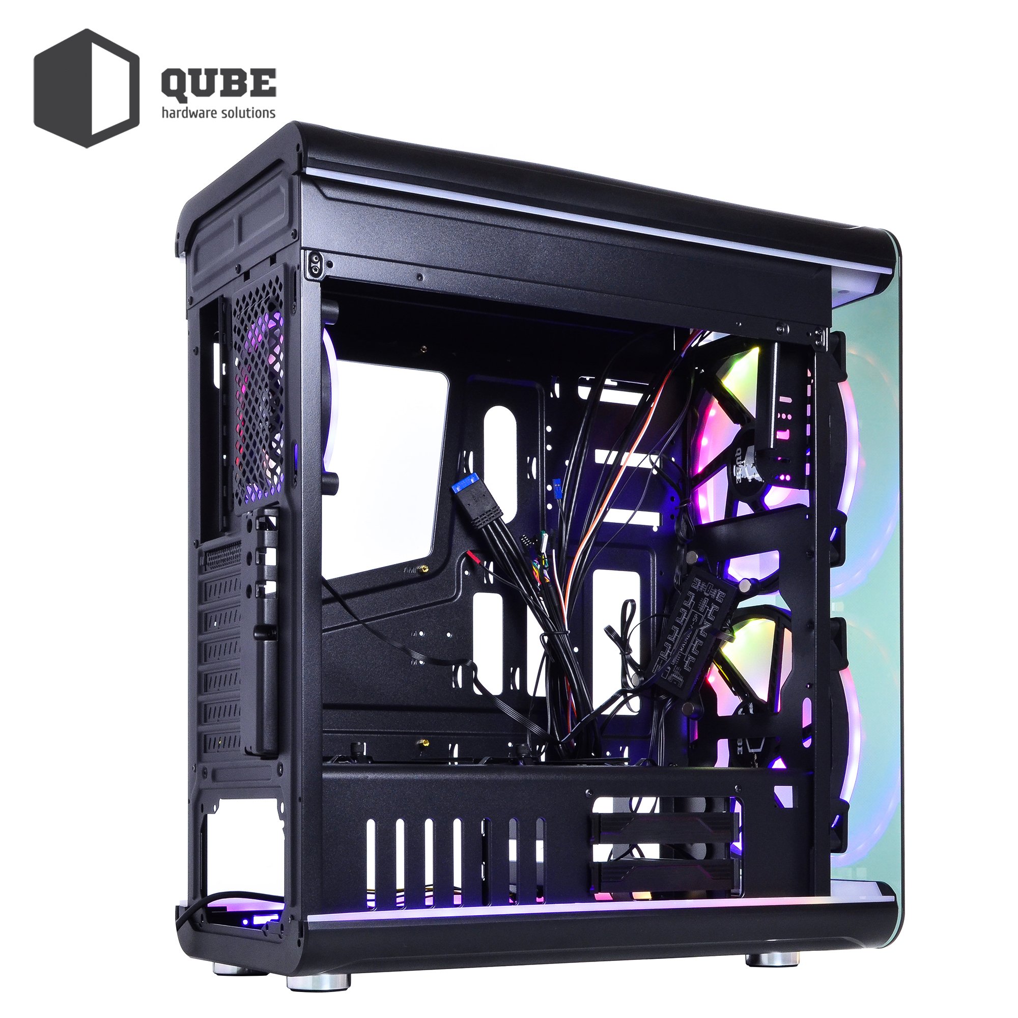 Одно из радикальных нововведений в новом QBM98 – установка производителем двух огромных 20 см вентиляторов за стеклом передней панели (плюс дополнительный 12 см на заднем торце). Их размер, безусловно, обеспечит отличную продуваемость во всех, даже технически ограниченных к доступу, местах, а увеличенный диаметр позволит снизить создаваемый уровень шума от вращения последних. И куда же в недешевом современном корпусе без RGB-освещения. Три кулера с управляемой адресной подсветкой и встроенные адресные ленты на боковых панелях придадут компьютеру шарма и настроятся под ваше душевное состояние.