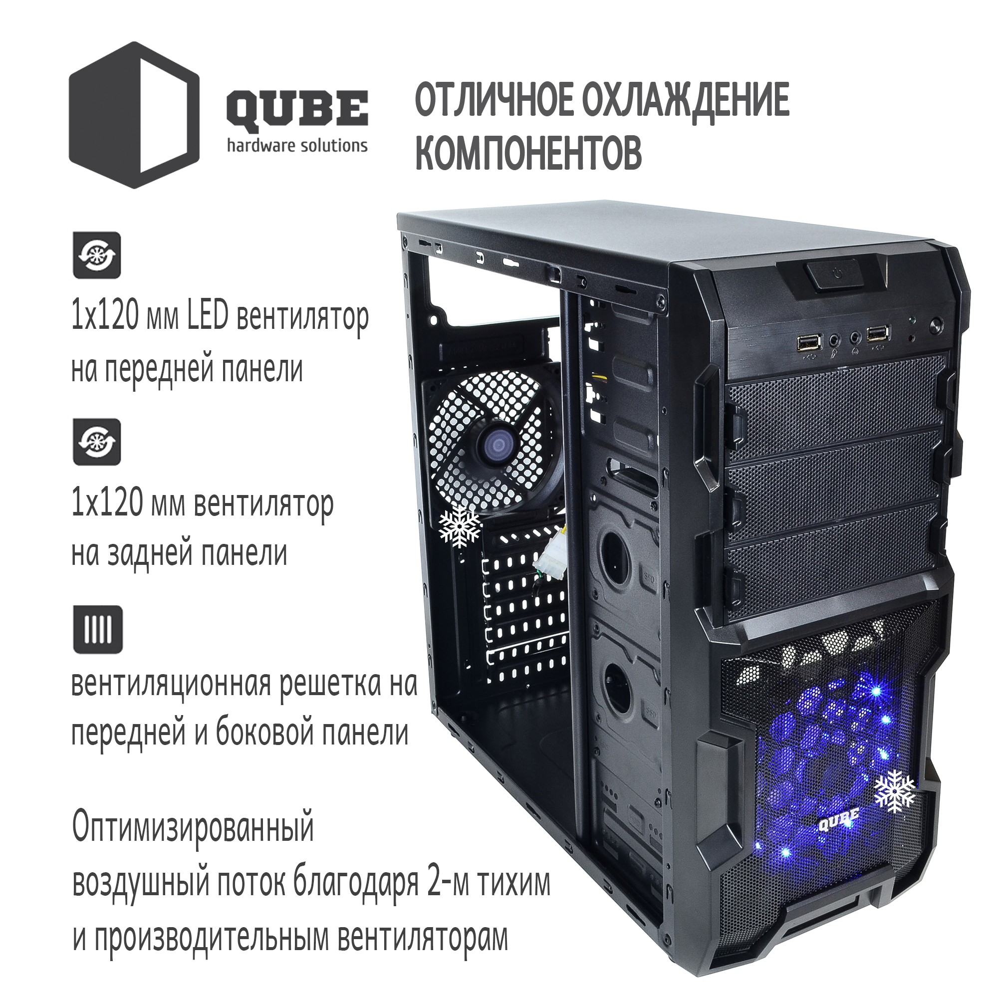 Наличие в корпусе QUBE QB932A нескольких предустановленных вентиляторов обеспечит отличную продуваемость во всех, даже технически ограниченных к доступу, местах.