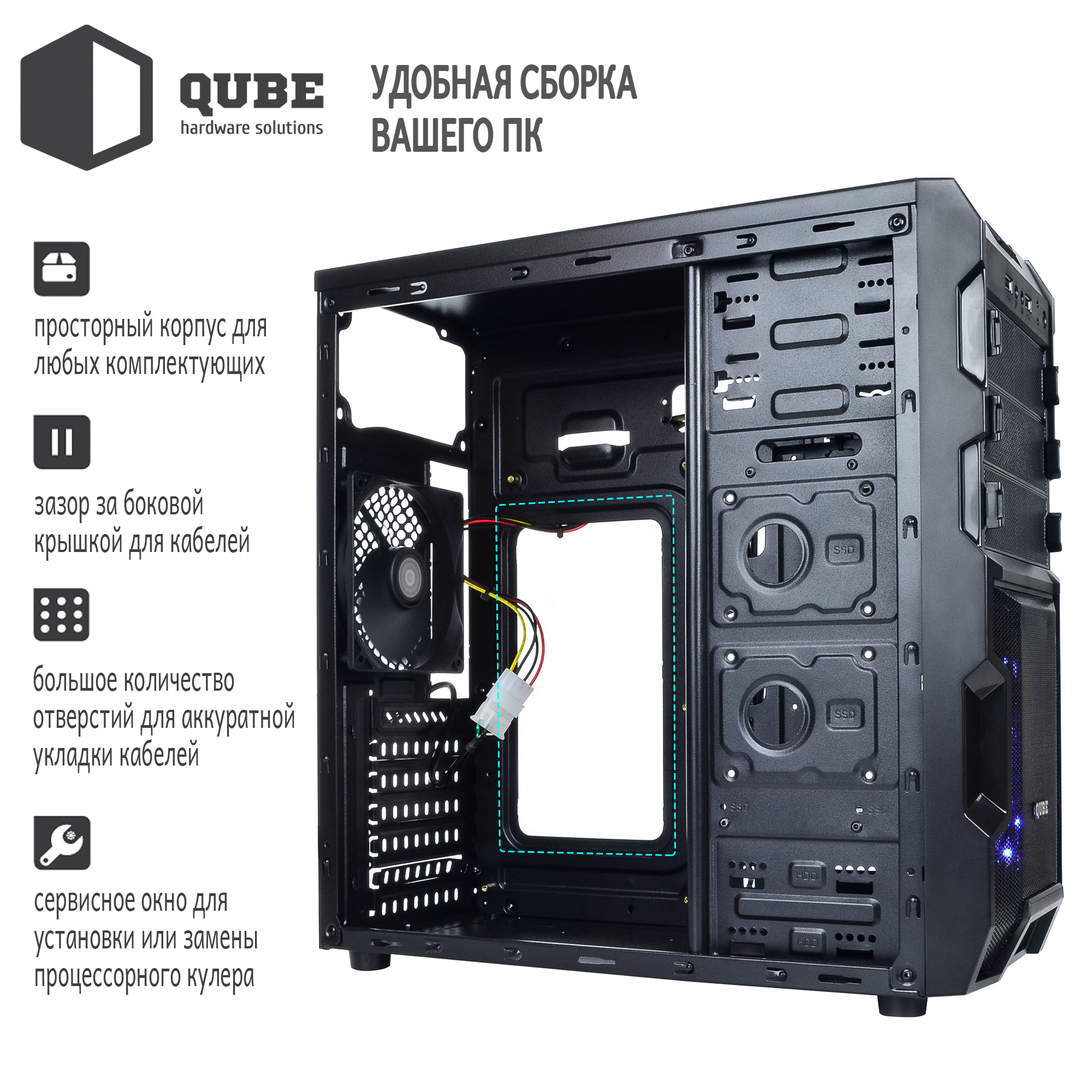 Фирменные корпуса QUBE отличаются современным дизайном, продуманной конструкцией, отличным функционалом и дружны к любому пользователю, который решился на самостоятельную сборку всех необходимых комплектующих в готовый персональный компьютер.
