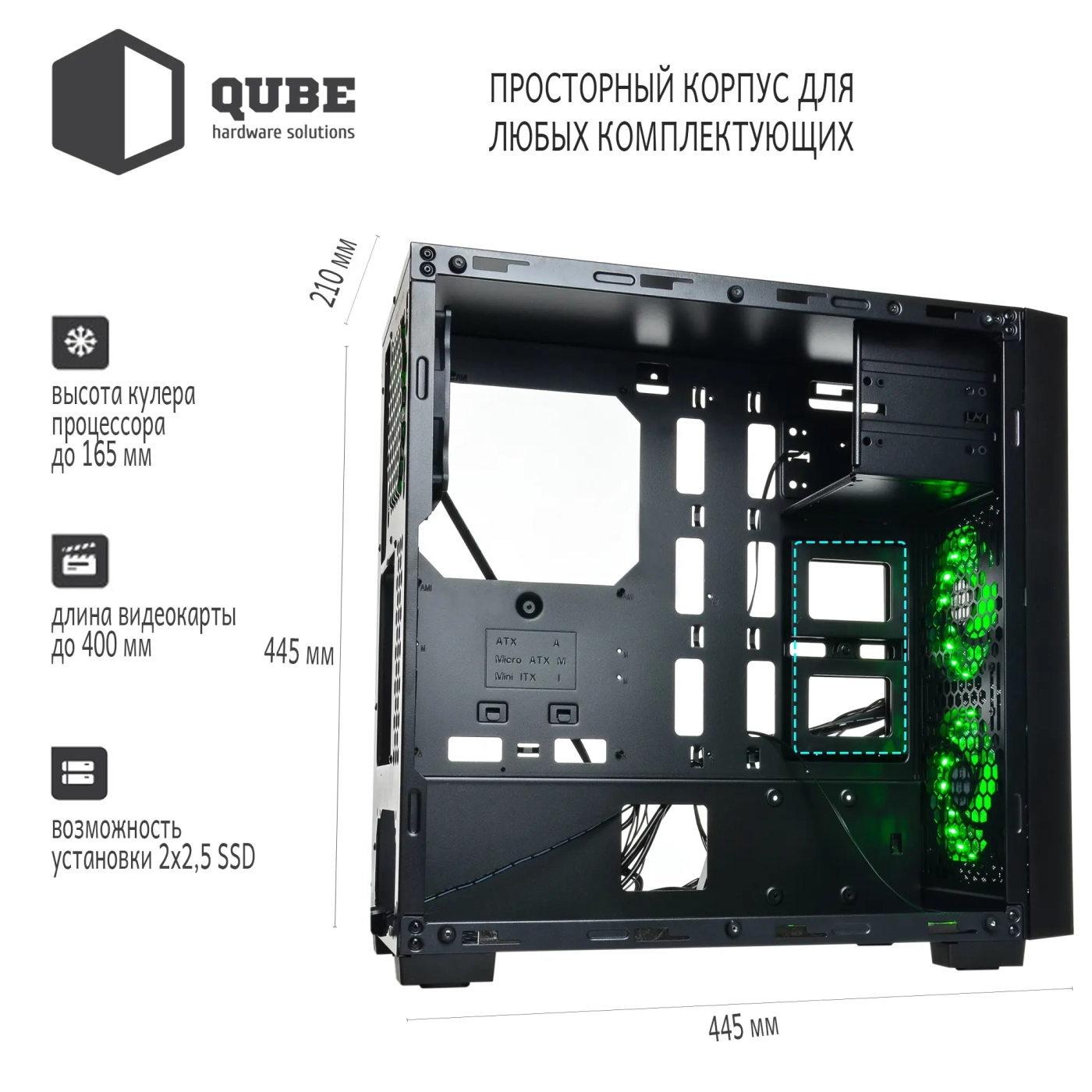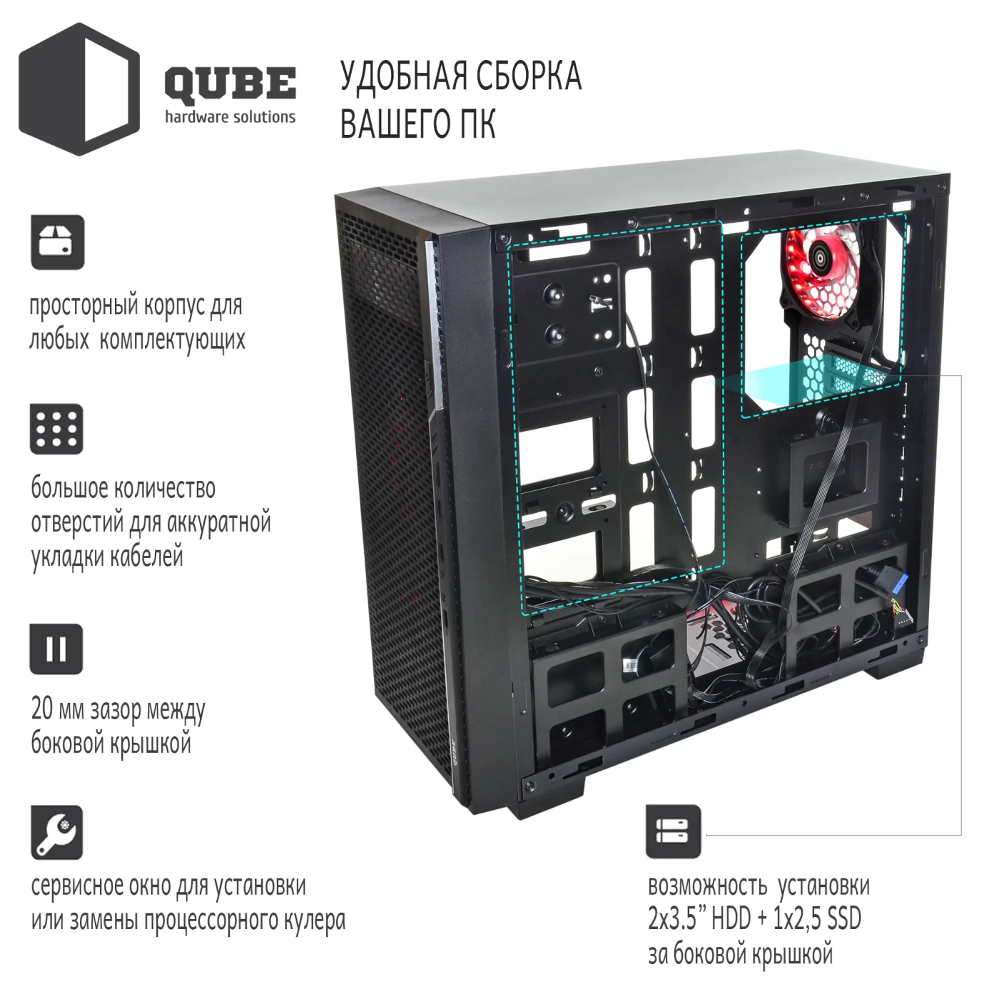 Модель QUBE QBF26 – это просторный корпус формата MiddleTower, который удовлетворит требования подавляющего числа пользователей. Все острые края листового металла толщиной 0.6 мм аккуратно зашлифованы или подогнуты, тем самым исключается любая возможность пораниться при сборке.