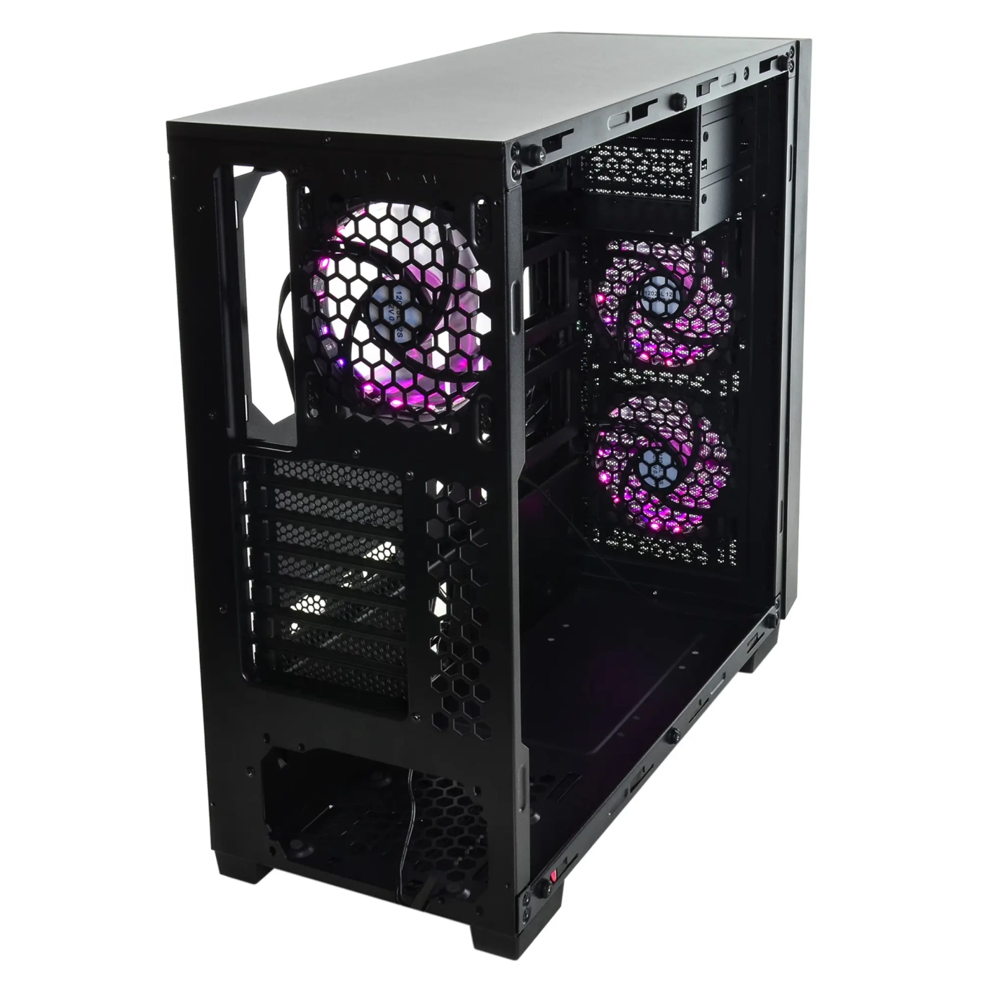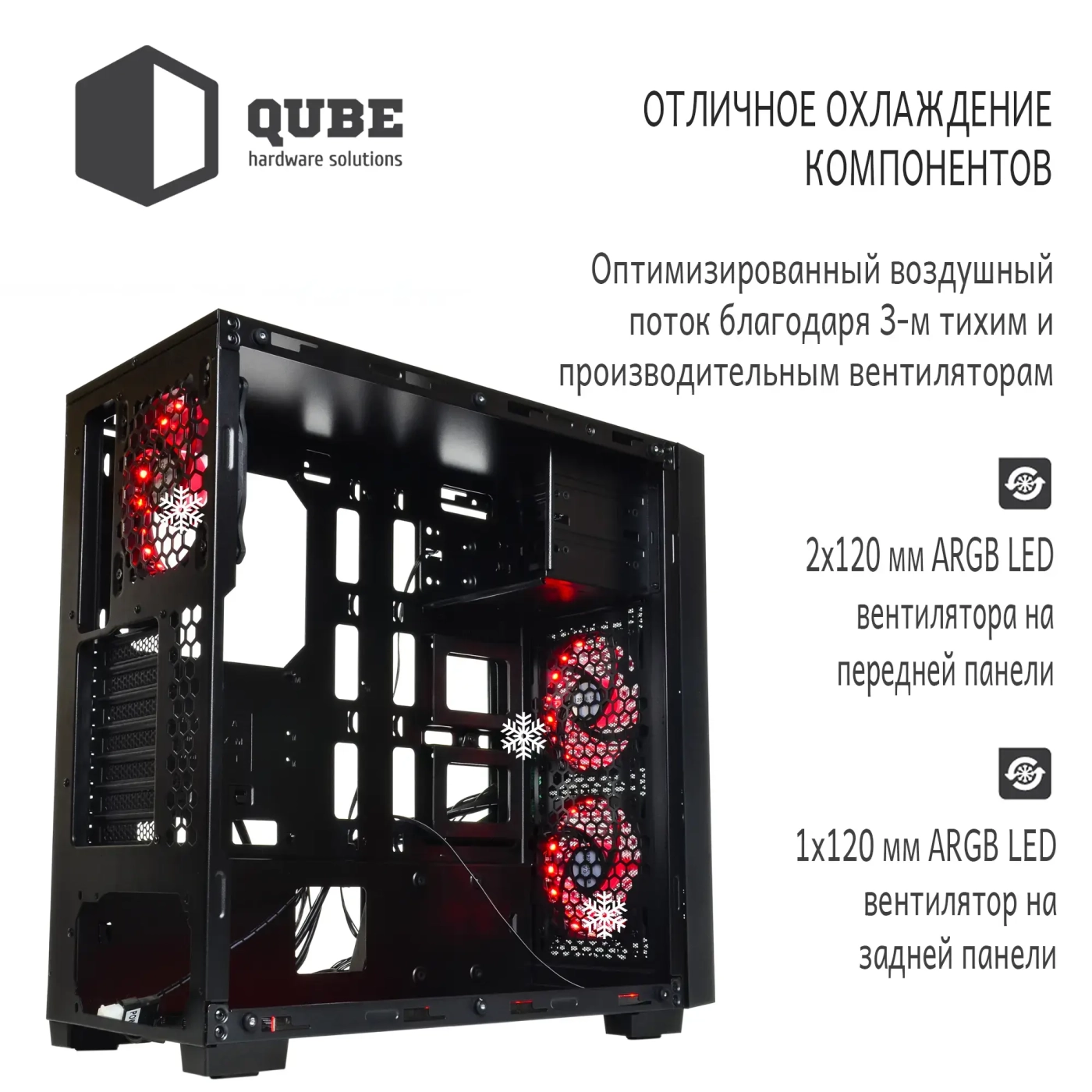 Наличие в корпусе QUBE QBF26 нескольких предустановленных вентиляторов с адресуемой подсветкой обеспечит отличную продуваемость во всех, даже технически ограниченных к доступу, местах, а также придаст кейсу самобытности и неординарности. Грамотно организованный кабель-менеджмент позволит уложить провода за боковую стенку и тем самым привести в порядок внутренний интерьер компьютера.