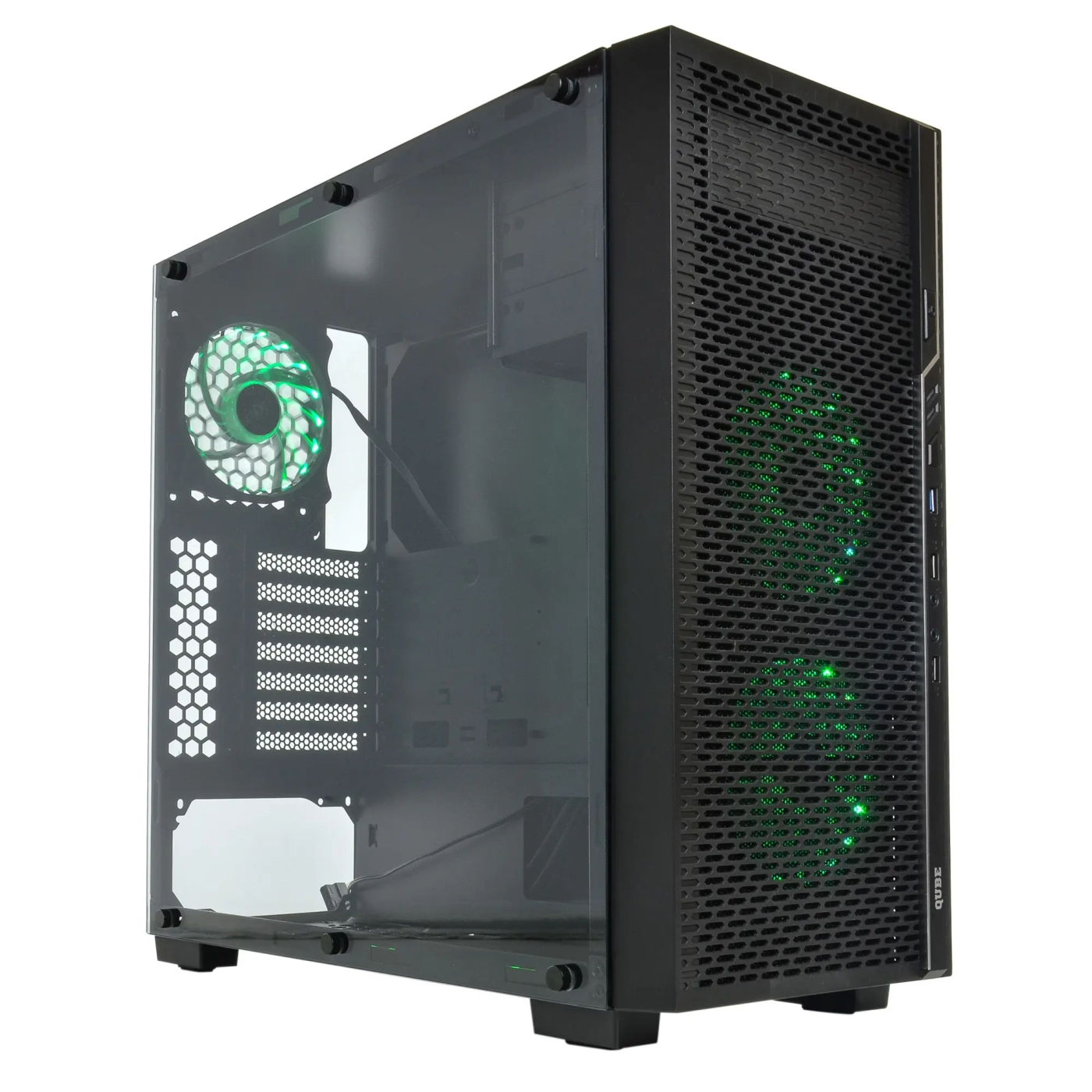 Необычно выполненная фронтальная панель черного цвета с перфорацией по всей площади несет несколько функций: красивый декор и отличная вентилируемая часть, которая не препятствует заходу воздуха внутрь кейса. На боковой грани возле кнопок включения и принудительной перезагрузки производитель вынес несколько портов USB, в том числе и высокоскоростной USB 3.0, а также аудио- и микрофонный разъемы.