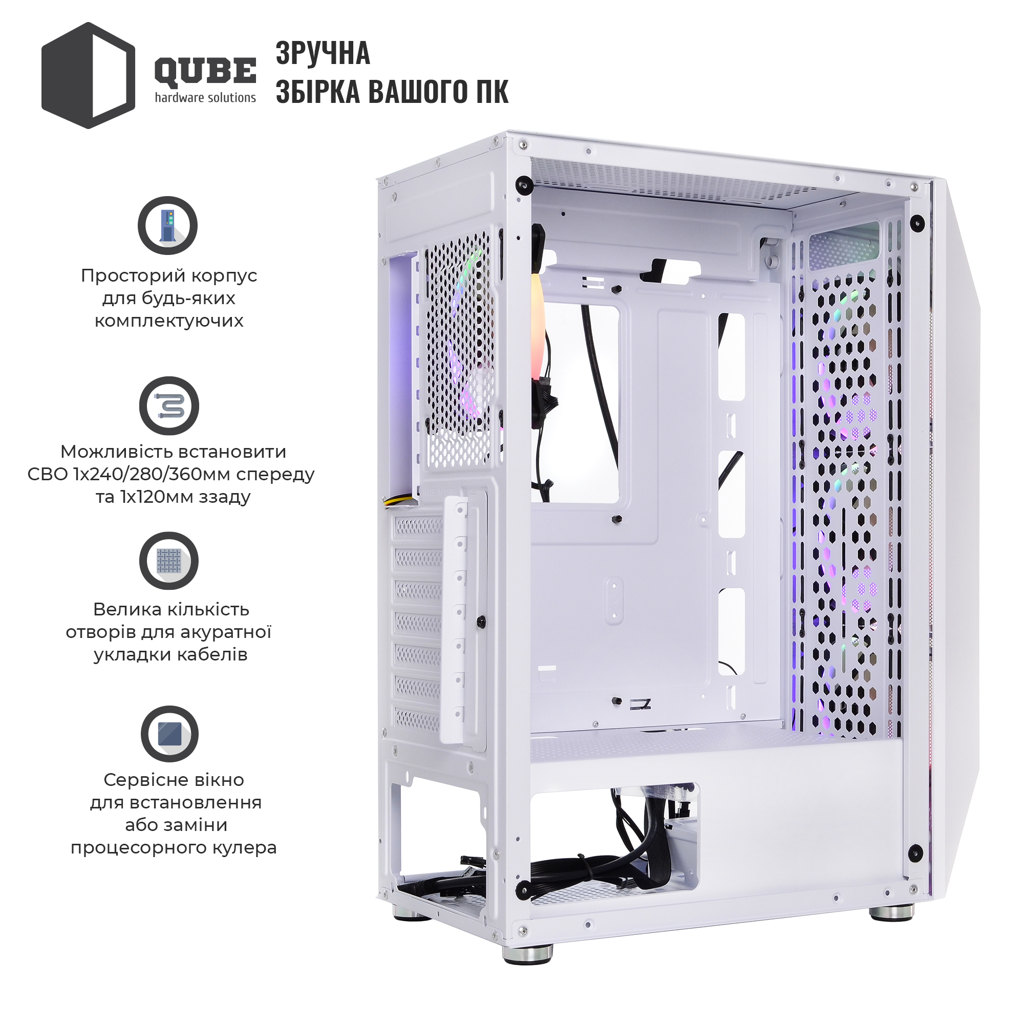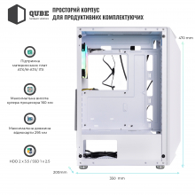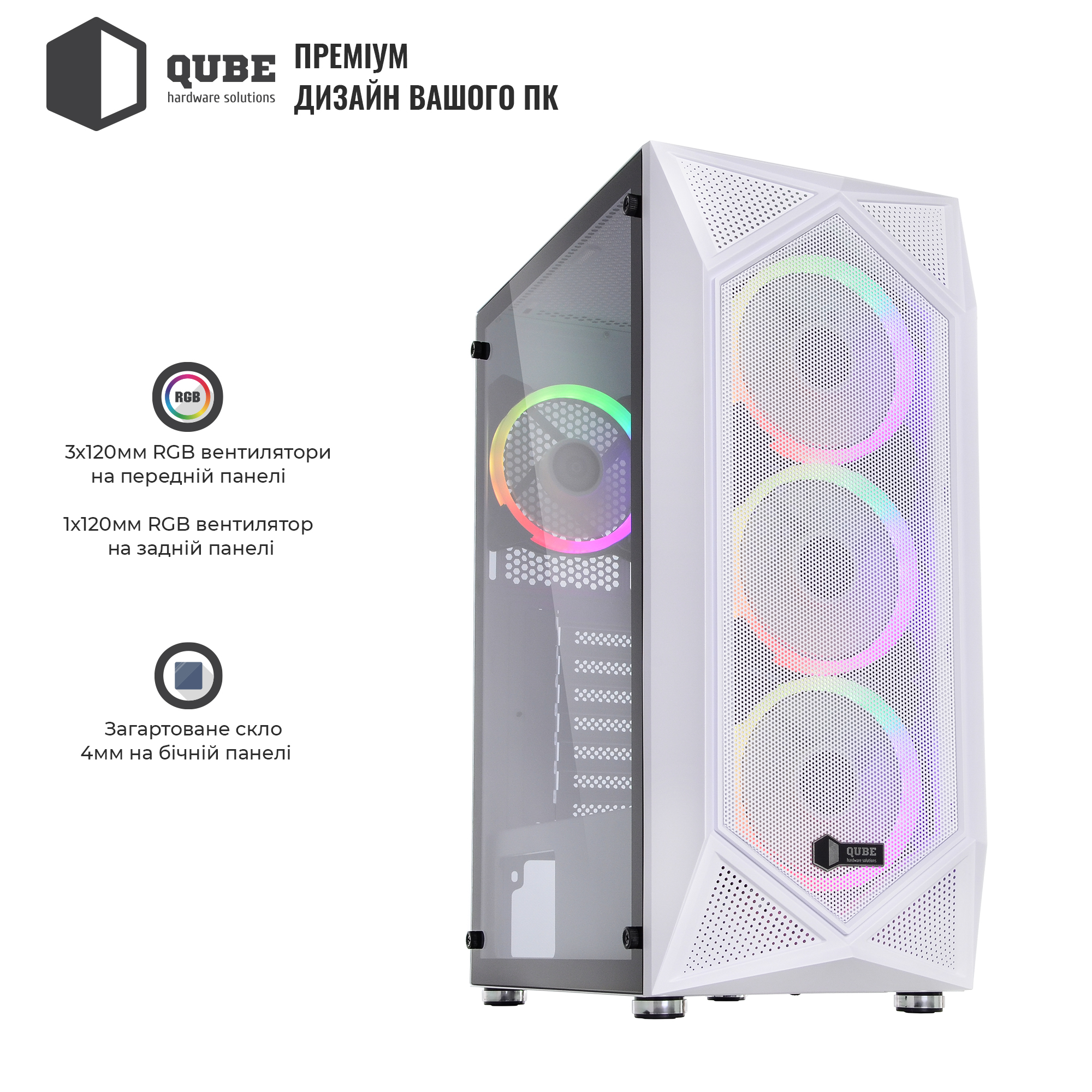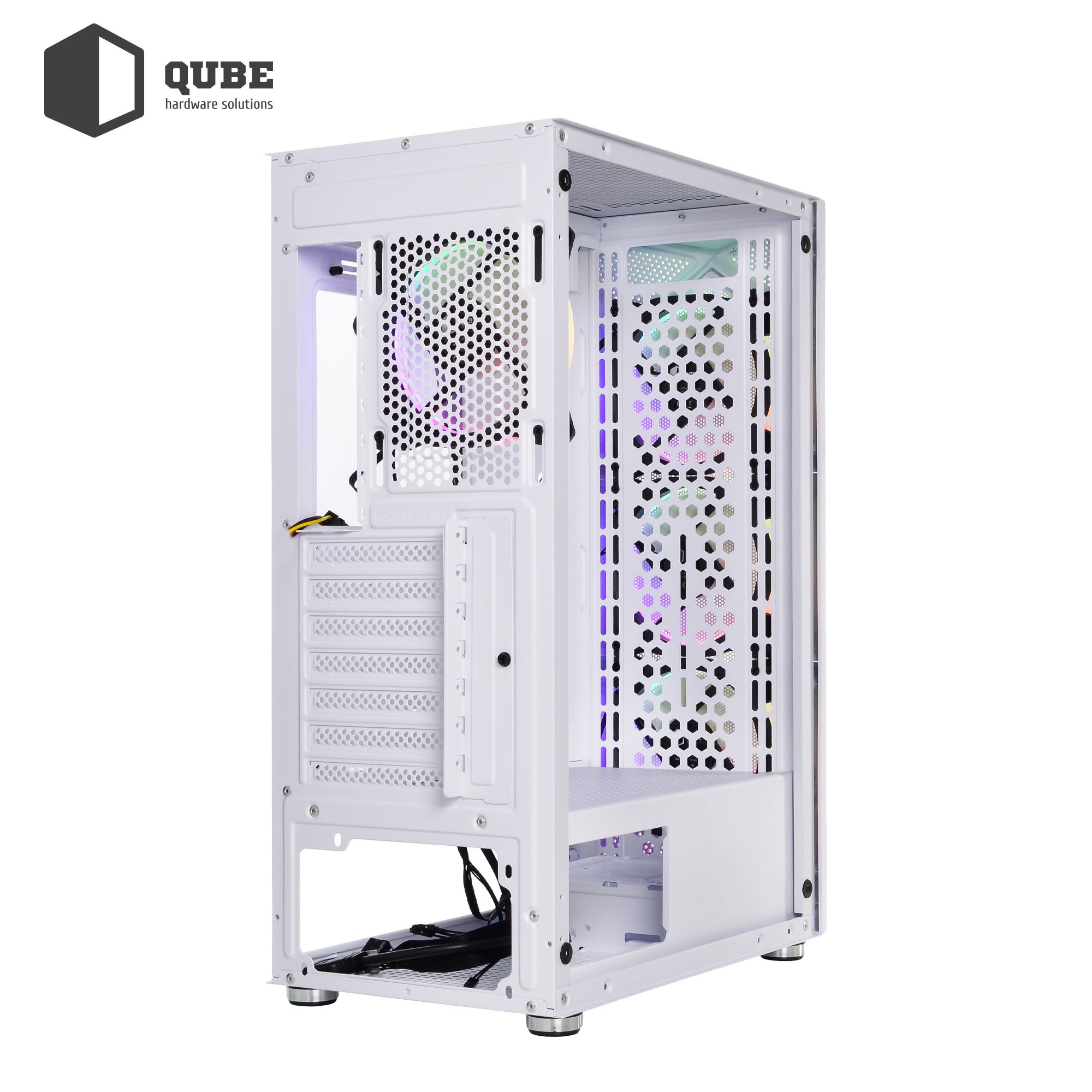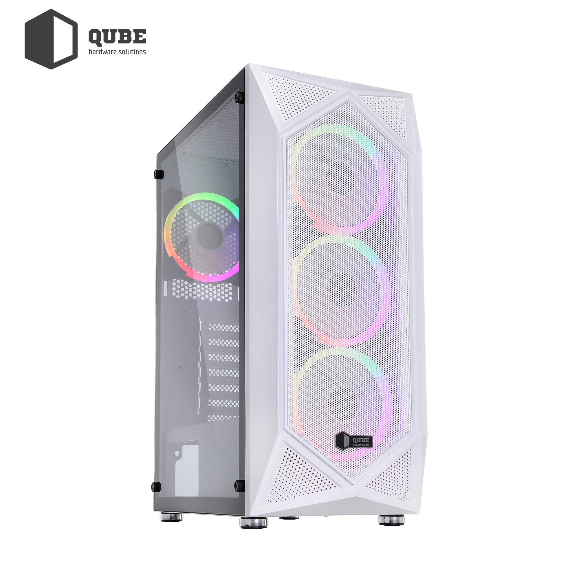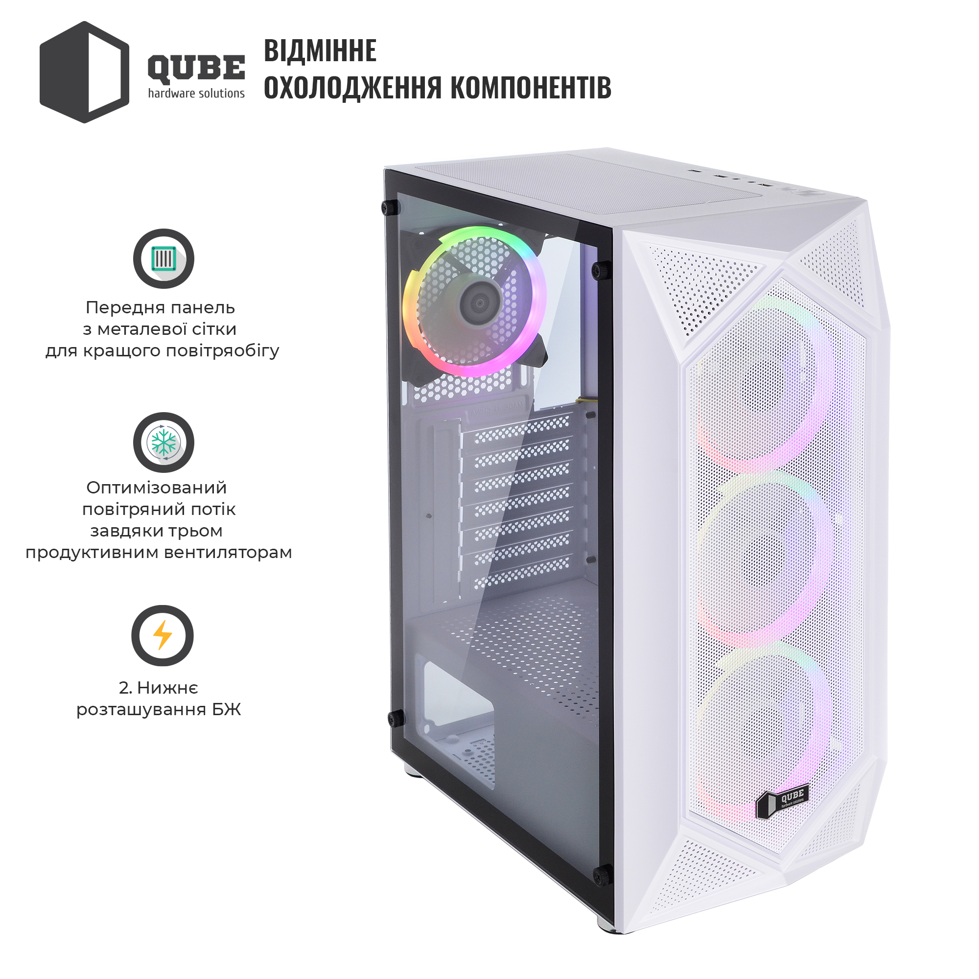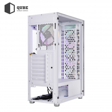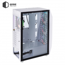 Модель QUBE SNOW_FMMU3 – это MiddleTower корпус белоснежно белого цвета с поддержкой материнских плат форм-фактора ATX. Стандартная и привычная большинству пользователей форма параллелепипеда дополнена в этой модели боковой панелью из прочного и тонированного закаленного стекла. Благодаря этому остается возможность видеть начинку корпуса, в частности – вентиляторы или СВО с подсветкой. Еще одной особенностью данной модели является передняя металлическая панель нестандартной формы, схожей с призмой, с перфорацией по всей поверхности. Множество мелких отверстий также присутствуют на верхней, нижней и задней панелях. Такое решение обеспечивает отличную вентиляцию внутри корпуса. Для защиты от попадания пыли и грязи установлены противопылевые фильтры.