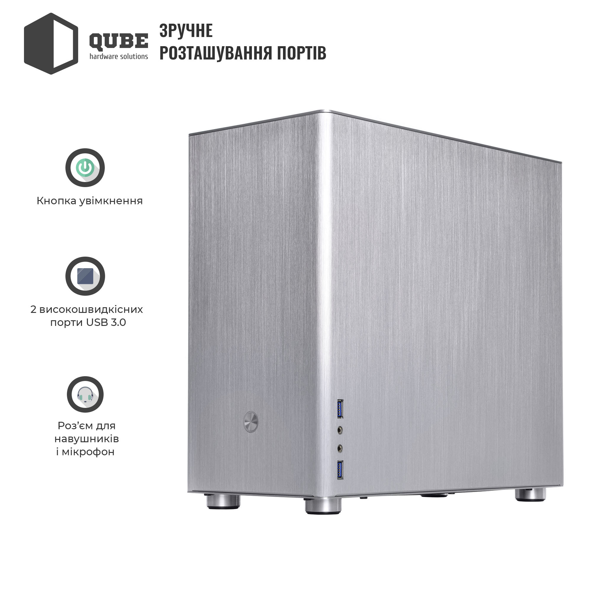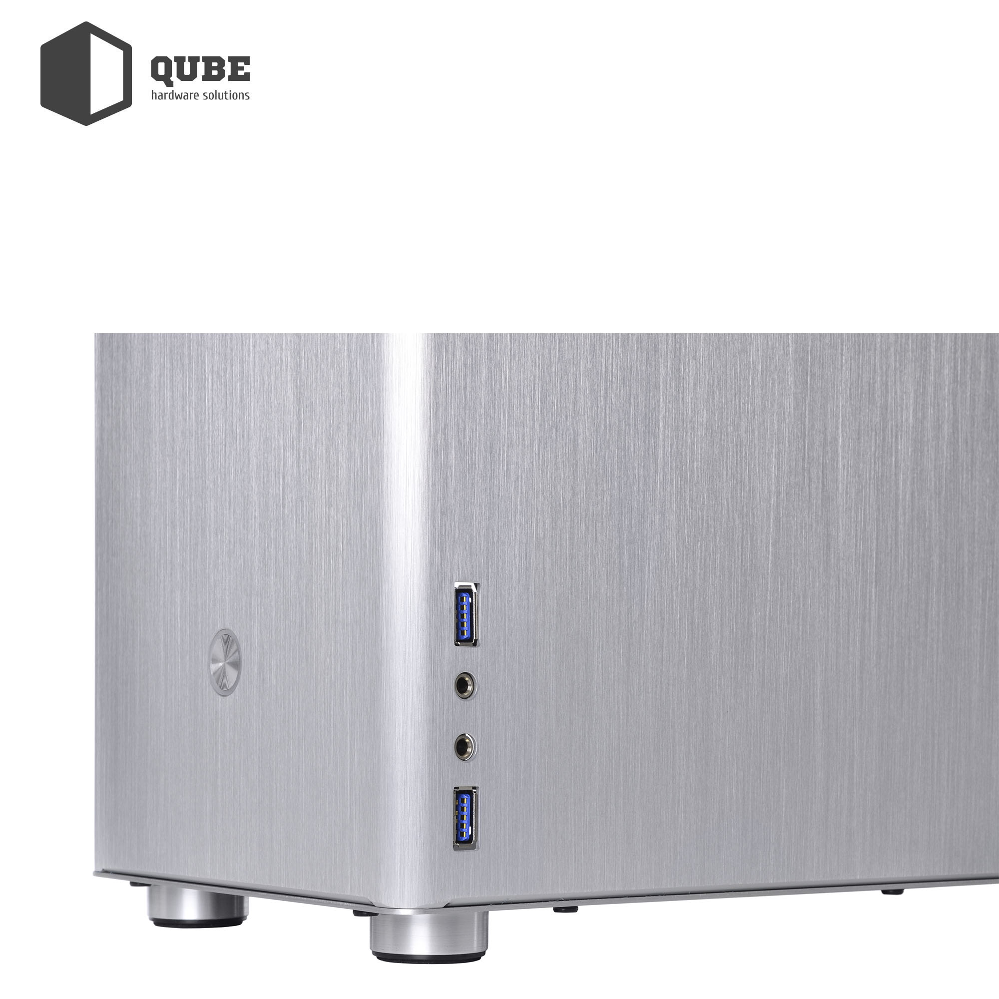 Особенность конструкции корпуса – панели из анодированного толстого алюминия, который закрывает с пяти сторон внутренний каркас. Такая конструкция отлично подойдет для пользователей, уважающих выдержанный стиль и элегантность в сочетании с небольшими габаритами. Спереди производитель разместил большую кнопку включения питания, в боковой части передней панели вынес два высокоскоростных порта USB 3.0, а также два аудиоразъема для подключения наушников и микрофона. На верхней и нижней гранях разместились противопылевые фильтры.