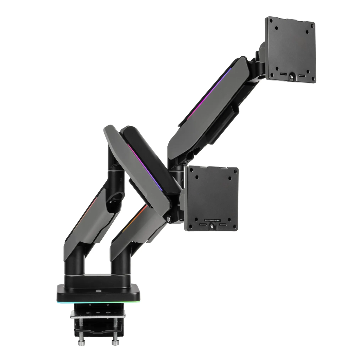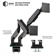 Крепление Qube RGB3520GD – это стильное и функциональное решение для монтажа двух мониторов с диагональю от 17" до 35". Оно обеспечивает удобное расположение экранов, поддерживая как плоские, так и изогнутые мониторы. С его помощью рабочее место можно сделать более эргономичным и эстетичным, благодаря продуманной системе укладки кабелей и RGB-подсветке, которая добавляет современный акцент. ?