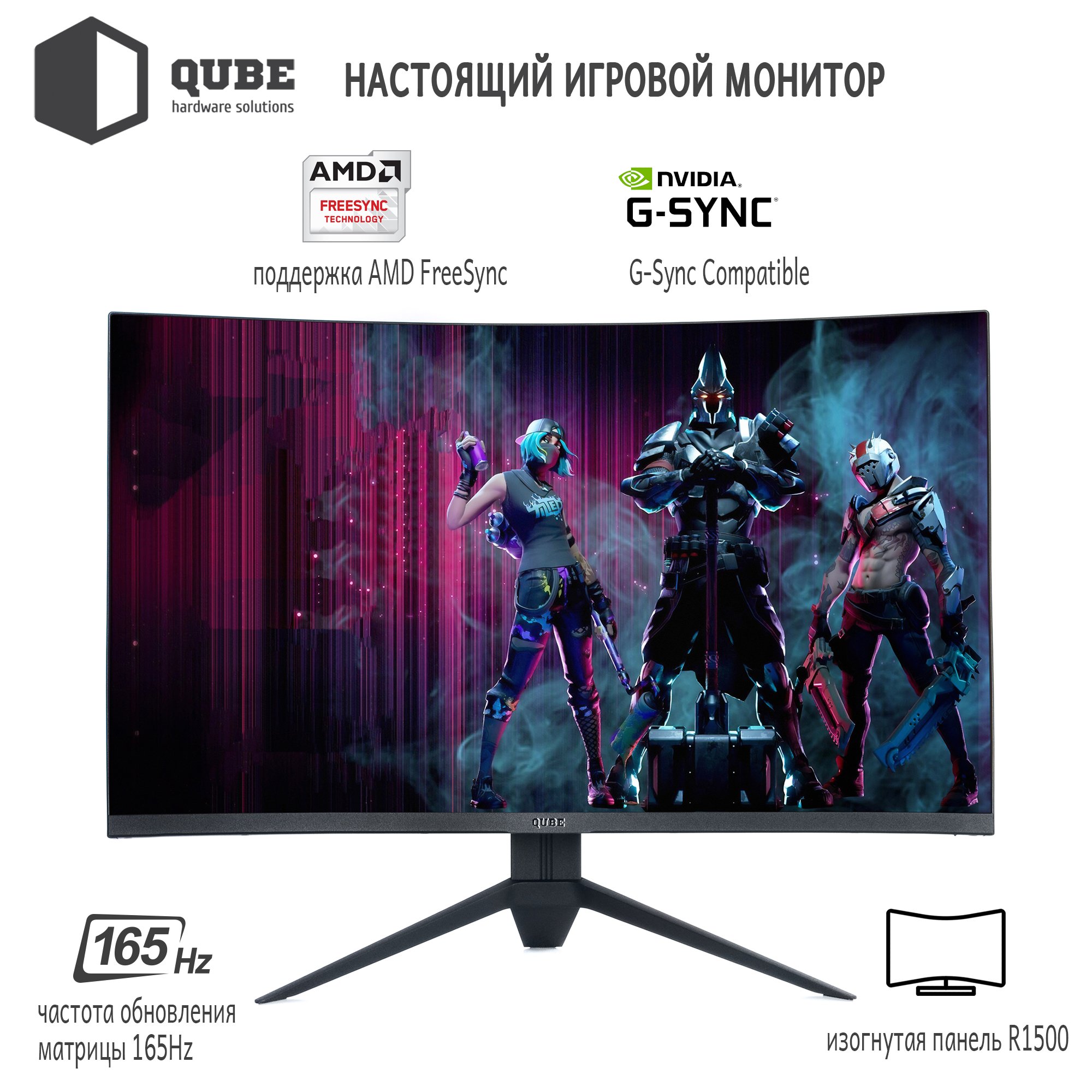 Монитор QUBE Overlord C27F165 / 27" / Full HD 1920х1080 / VA / 165Hz / 4ms / 16:9 / 400 cd|m² / 3 000:1 / 54W / 100x100 / 36мес. / C27F165