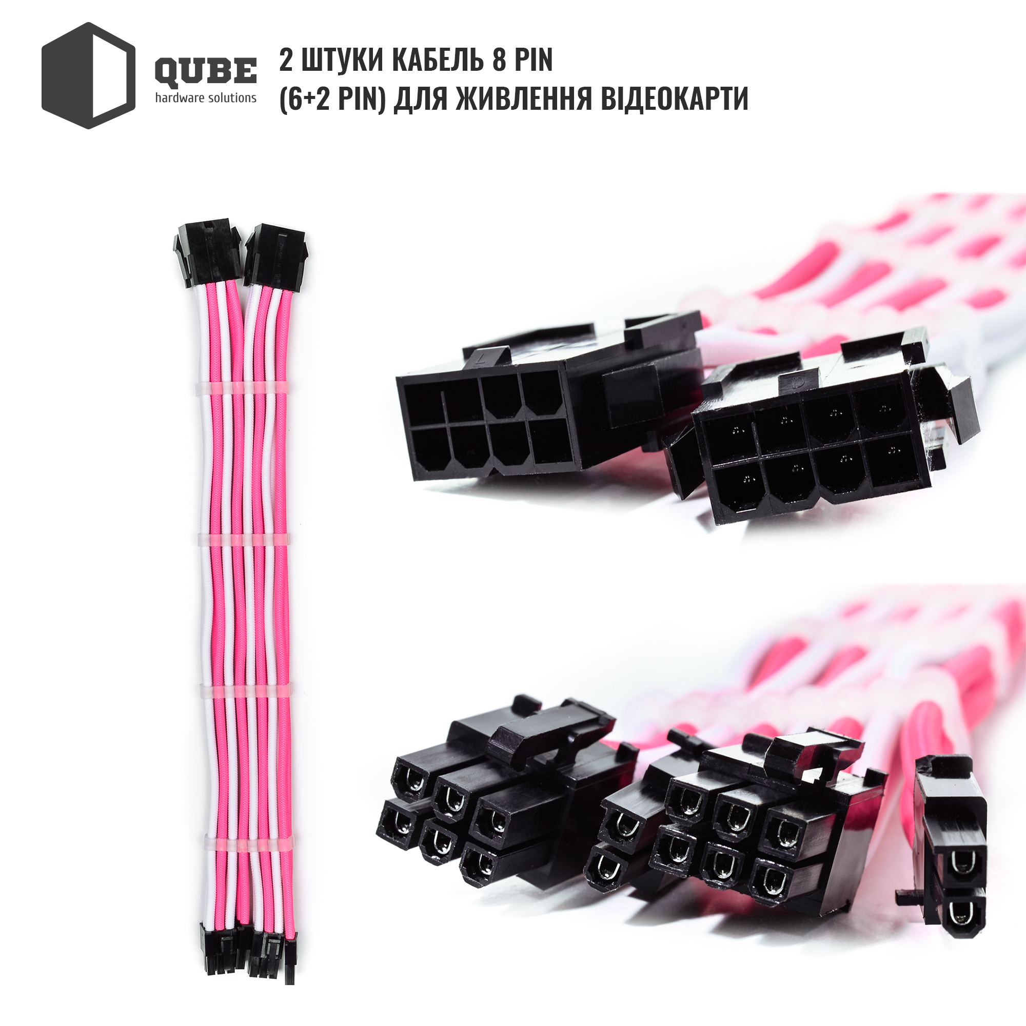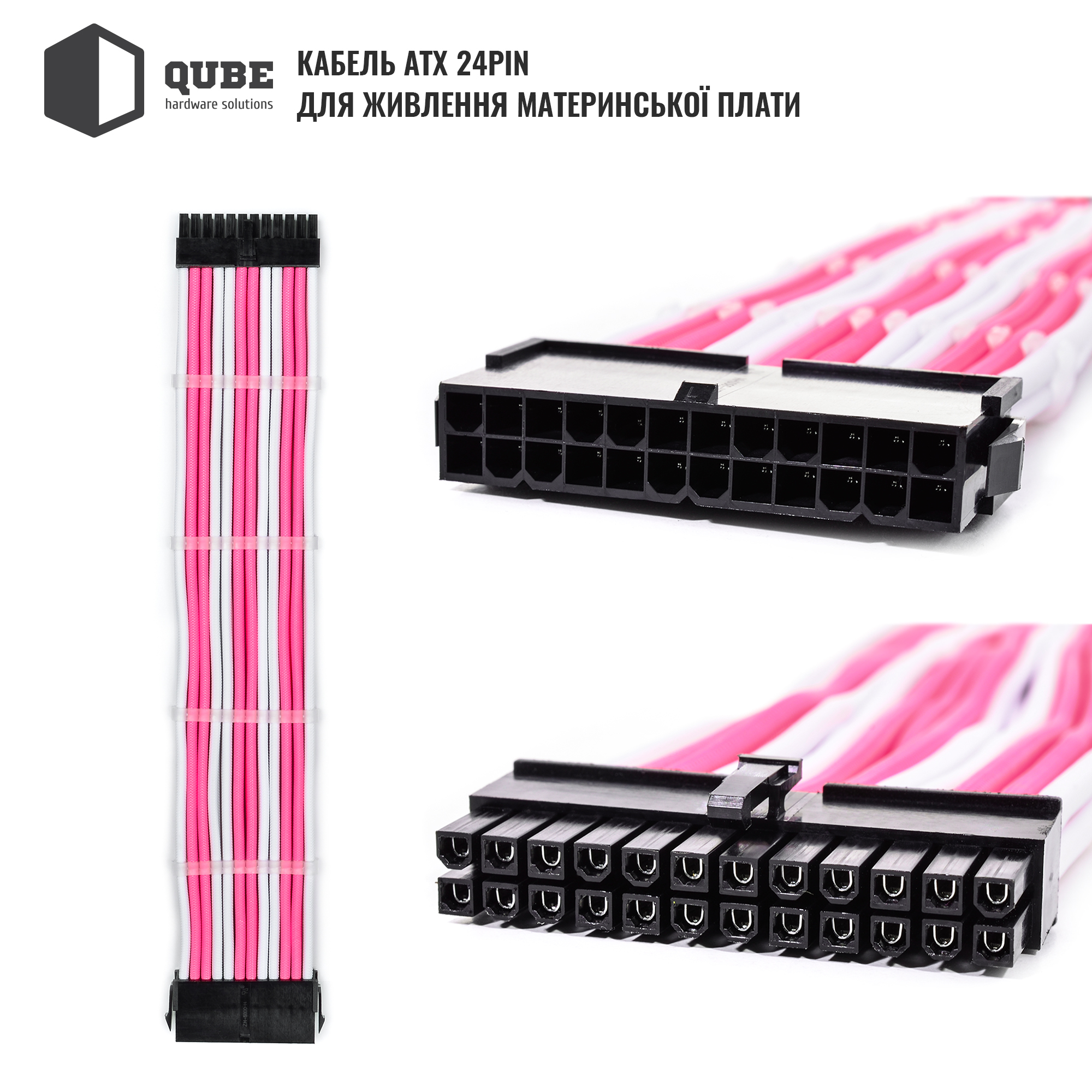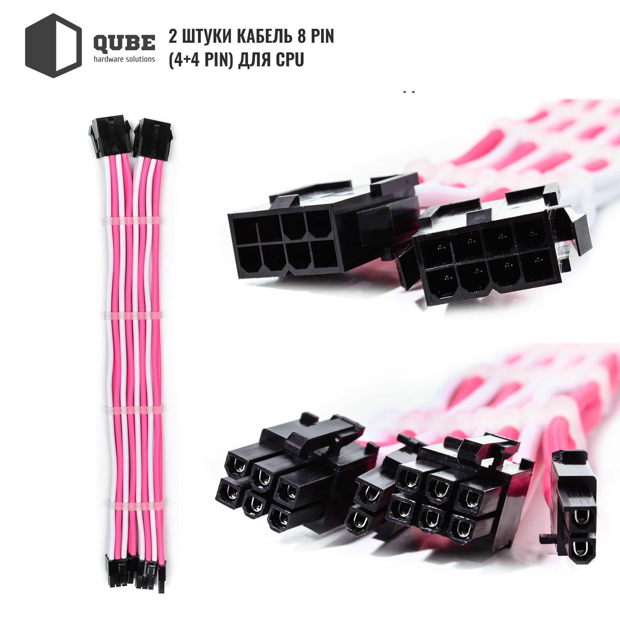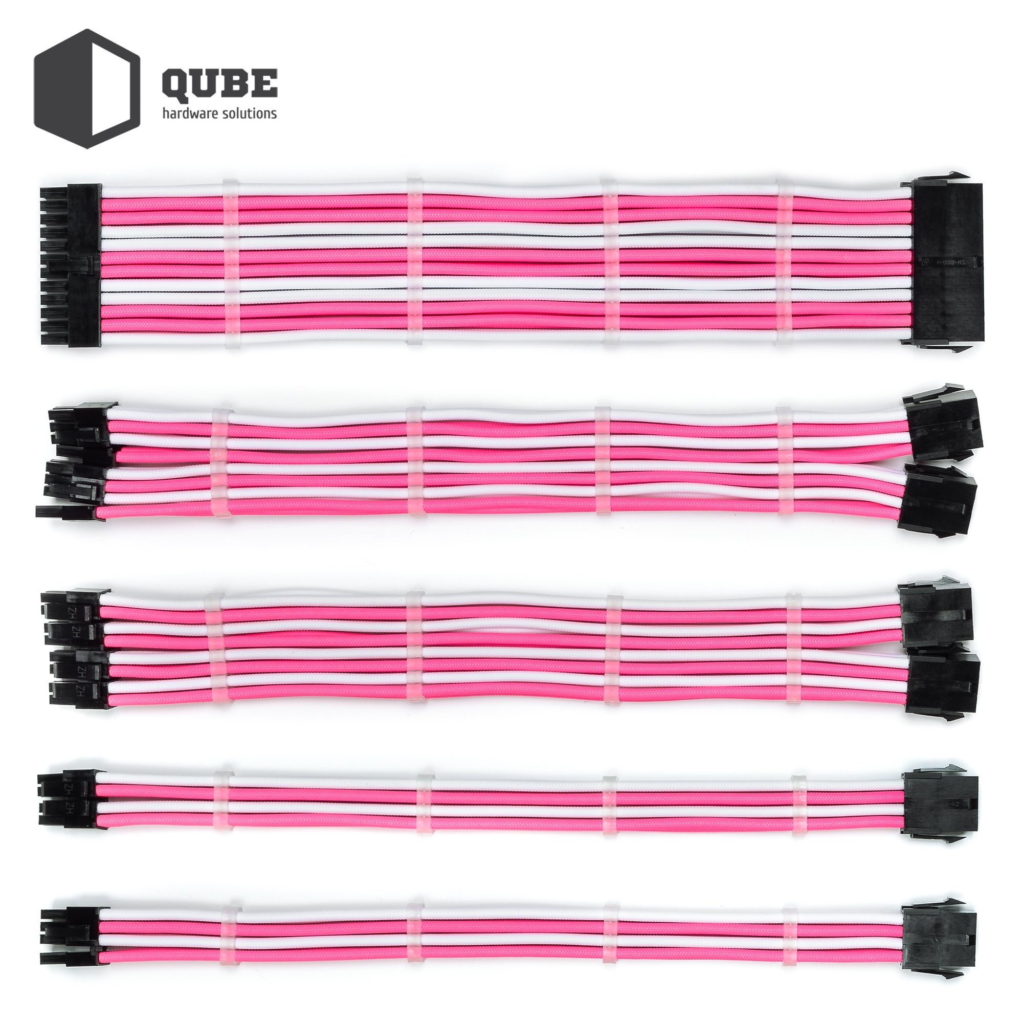 Комплект кабелей-удлинителей для блока питания с комбинированными разъемами длиной 350 мм. Изготавливаются с применением качественной нейлоновой оплетки комбинированных цветов (белого и розового) и толстого медного кабеля 16AWG.