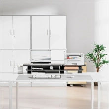 Габариты 1060×275×296 мм поднимают экран до комфортной высоты глаз, разгружая шею и плечи при длительной работе. Освободившееся под платформой место аккуратно прячет клавиатуру, мышь и аксессуары, а также помогает организовать кабели. Конструкция весом 11,1 кг уверенно стоит на столе и гасит мелкие колебания, сохраняя чёткость изображения при активной печати или динамичных играх.