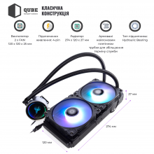 QUBE QB-OLWC240C – это закрытая система жидкостного охлаждения с двухсекционным радиатором и двумя 12 см вентиляторами с цветной адресной RGB-подсветкой. Она создана специально для компьютерных энтузиастов и будет отличным выбором тех пользователей, которым необходимо более продвинутое, по сравнению с воздушным кулером, эффективное решение для охлаждения даже производительного процессора. И чтобы при этом не нужно было бы беспокоиться о возможных проблемах совместимости или отсутствия необходимых запчастей в комплекте, правильного количества фитингов или длины соединительной трубки.