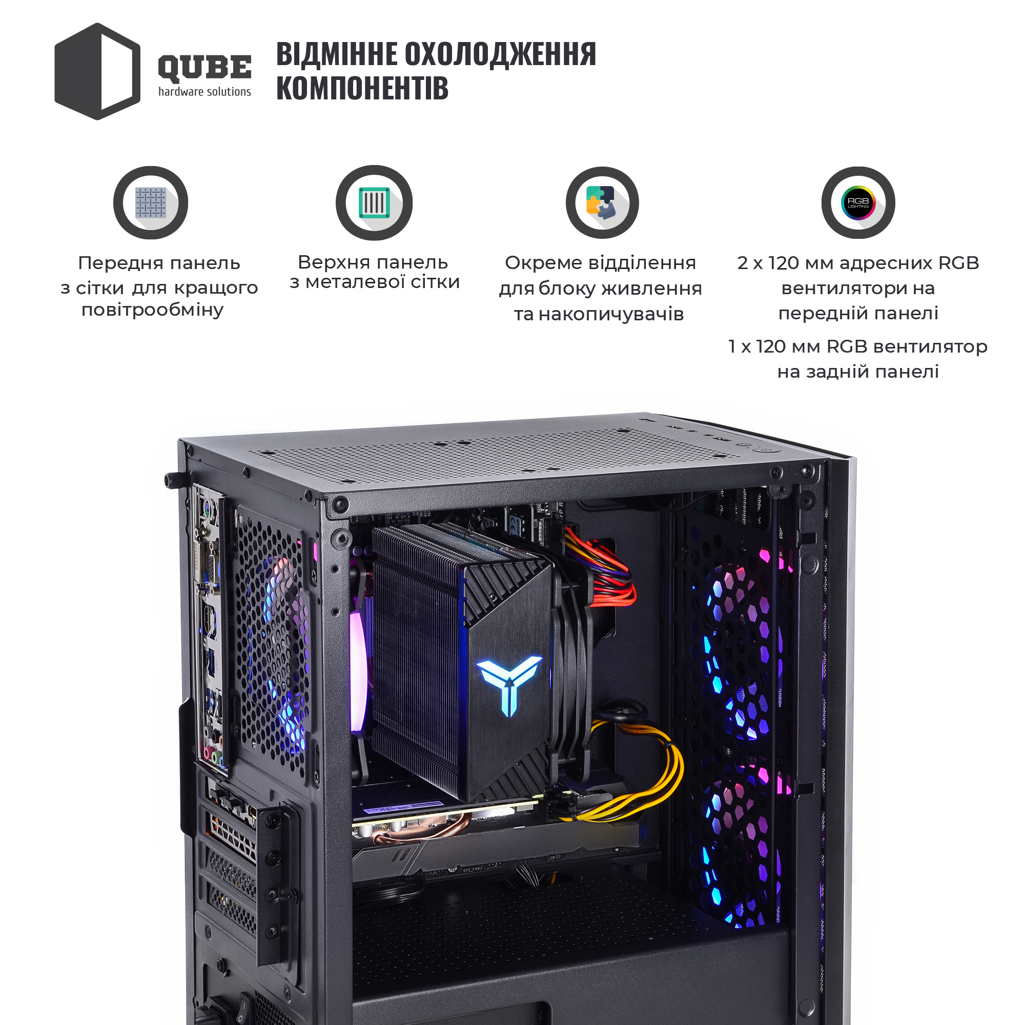 - Эффектный корпус QUBE BLOCK ARGB формата MiniTower с блоком питания на 600 Вт и тремя красочными RGB LED вентиляторами, поддерживающими оптимальный воздушный поток внутри.