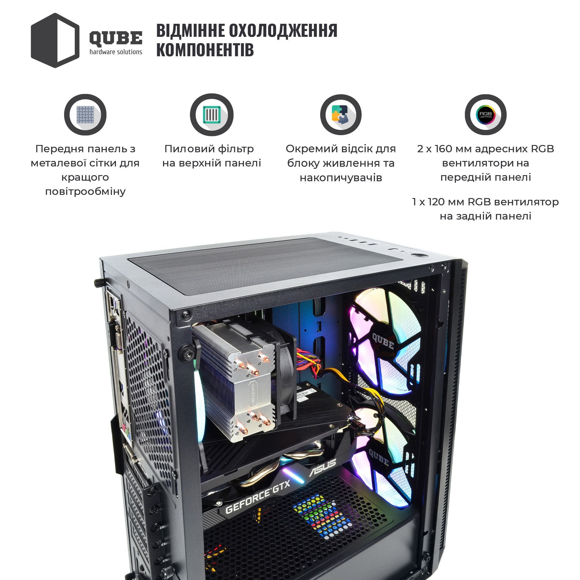 - Фирменный корпус с боковой стеклянной панелью, блоком питания на 600 Вт и 3 RGB LED вентиляторами, оберегающими компоненты от перегрева.