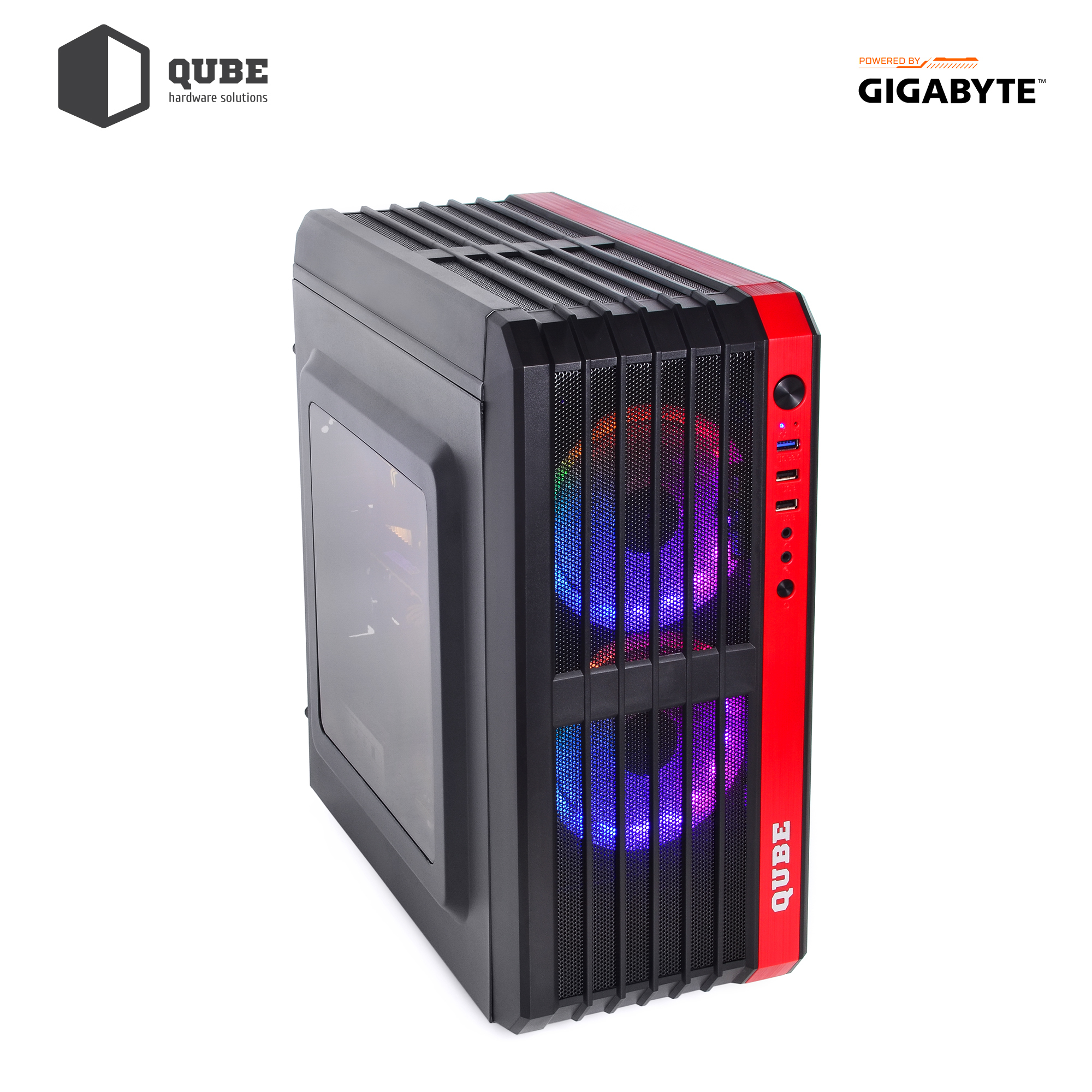 - Корпус QUBE QB43M с передней сетчатой панелью, прозрачным окном на боковой панели, блоком питания GIGABYTE на 550 Вт "бронзовой" сертификации и тремя яркими LED вентиляторами.