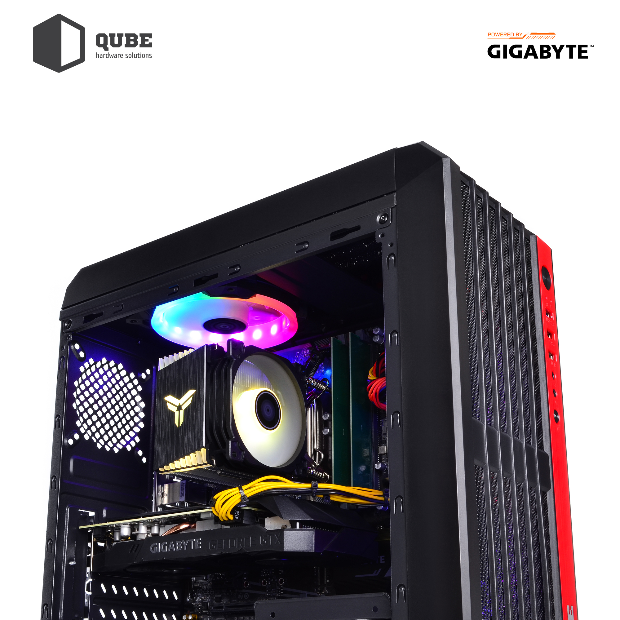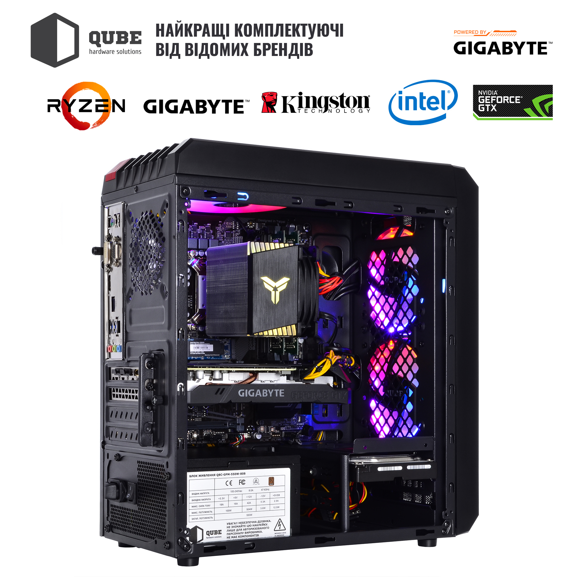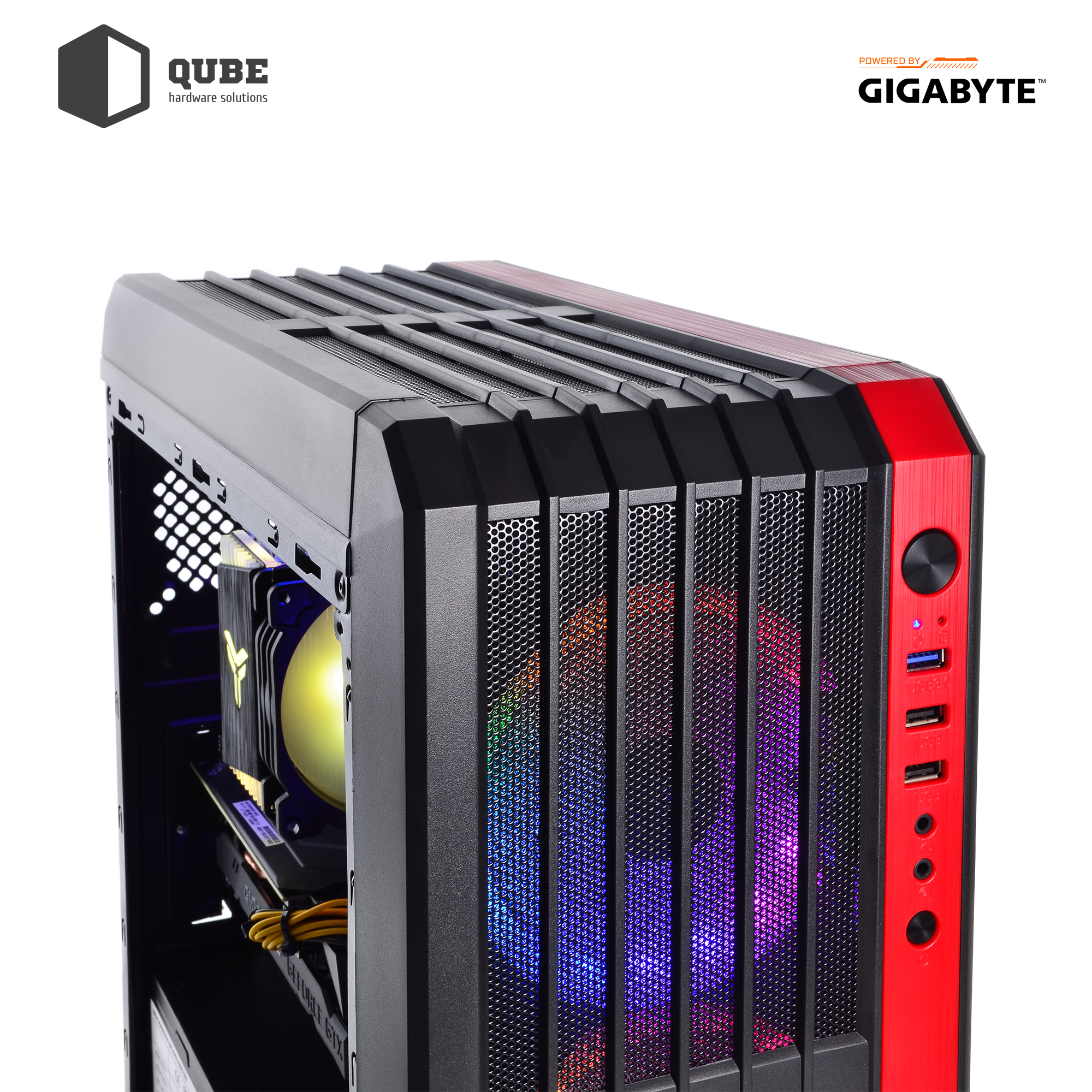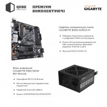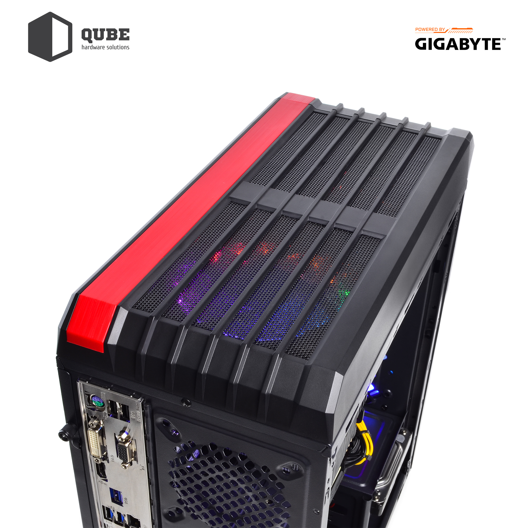 - Черный с яркой красной полоской корпус QUBE QB43M формата MiddleTower с блоком питания на 550 Вт сертификации 80+ Bronze от производителя GIGABYTE и тремя LED вентиляторами для поддержания оптимальной температуры внутри.