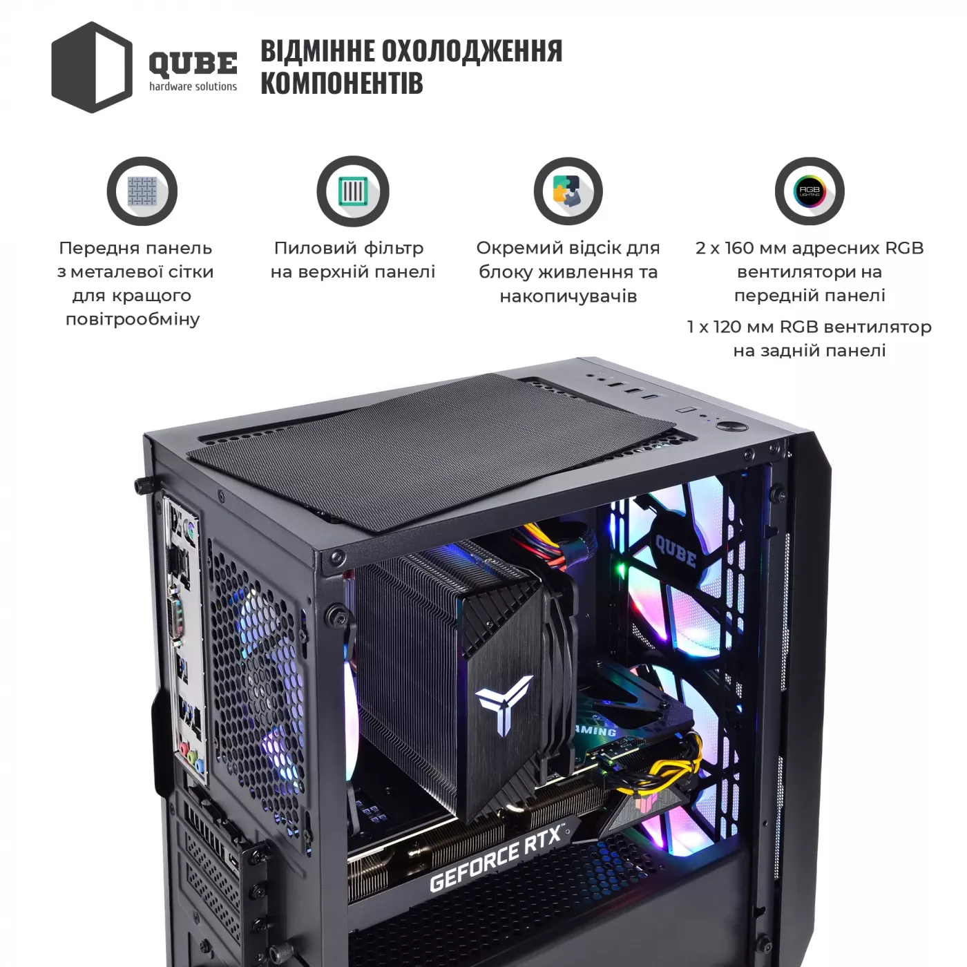Корпус QB-OL1400 RGB сочетает стильный дизайн, прозрачную боковую панель и продуманную систему охлаждения, которая эффективно поддерживает оптимальную температуру всех комплектующих. RGB-подсветка подчёркивает современный внешний вид и добавляет эстетической выразительности всей системе. Материнская плата на базе B450 обеспечивает стабильную работу компонентов, а блок питания QUBE NEPTUNE Mini 600W гарантирует надёжное и безопасное энергоснабжение даже при серьёзной игровой нагрузке.
