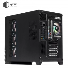Корпус QUBE MIRAGE Black сочетает премиальную эстетику и продуманную термодинамику. Закалённое стекло толщиной 4 мм на передней и боковой панелях подчеркивает дизайн внутренней подсветки. Система охлаждения включает девять вентиляторов 120mm RGB LED: три внизу, три сбоку, один сзади и три сверху для поддержки работы водяного охлаждения. Такая конфигурация обеспечивает мощный воздушный поток и стабильную температуру даже при интенсивных игровых сессиях.