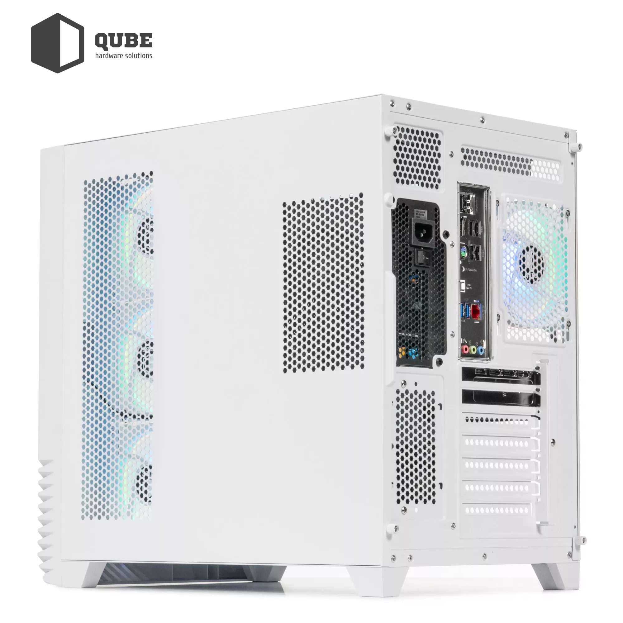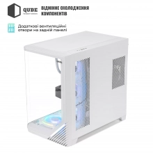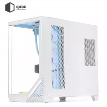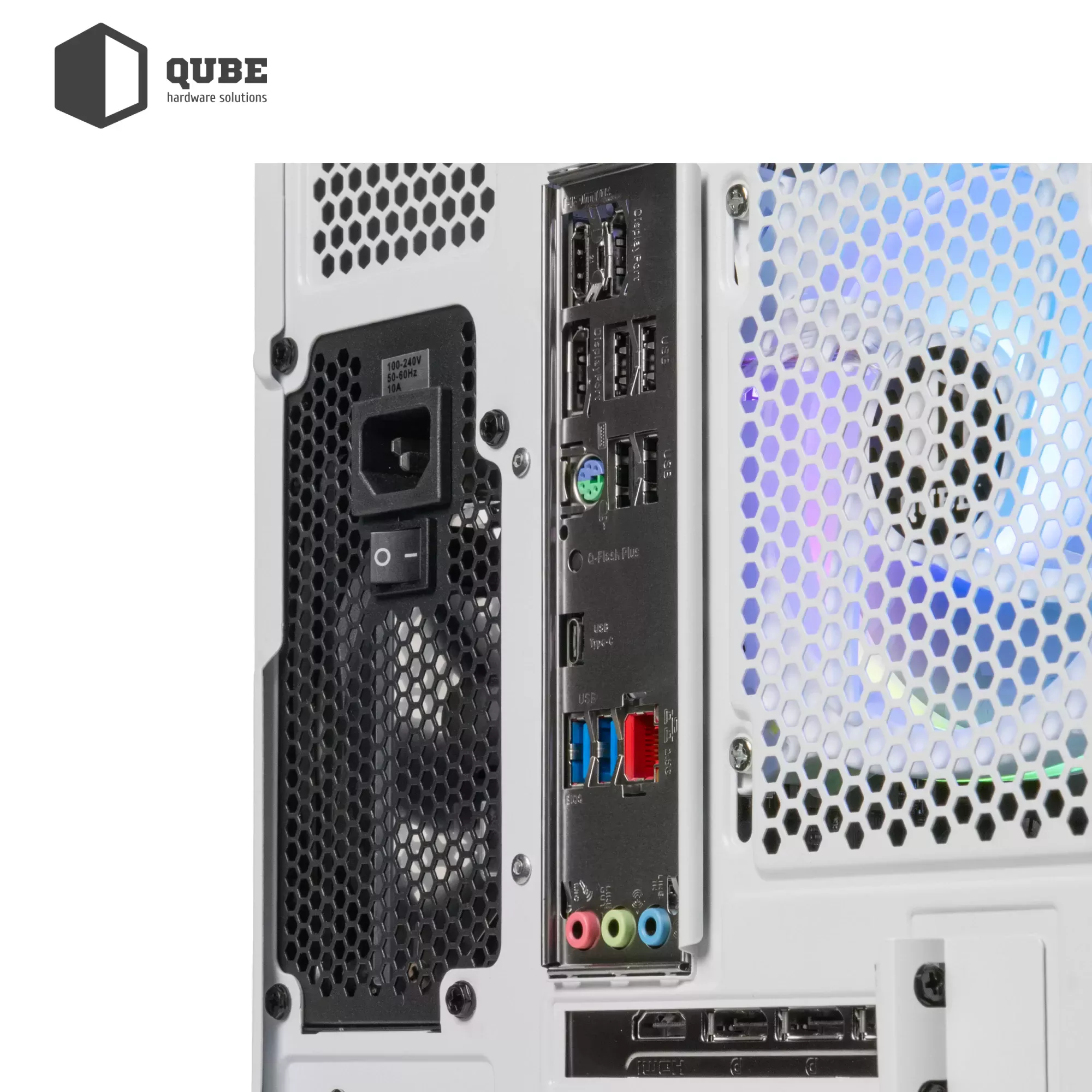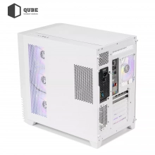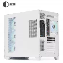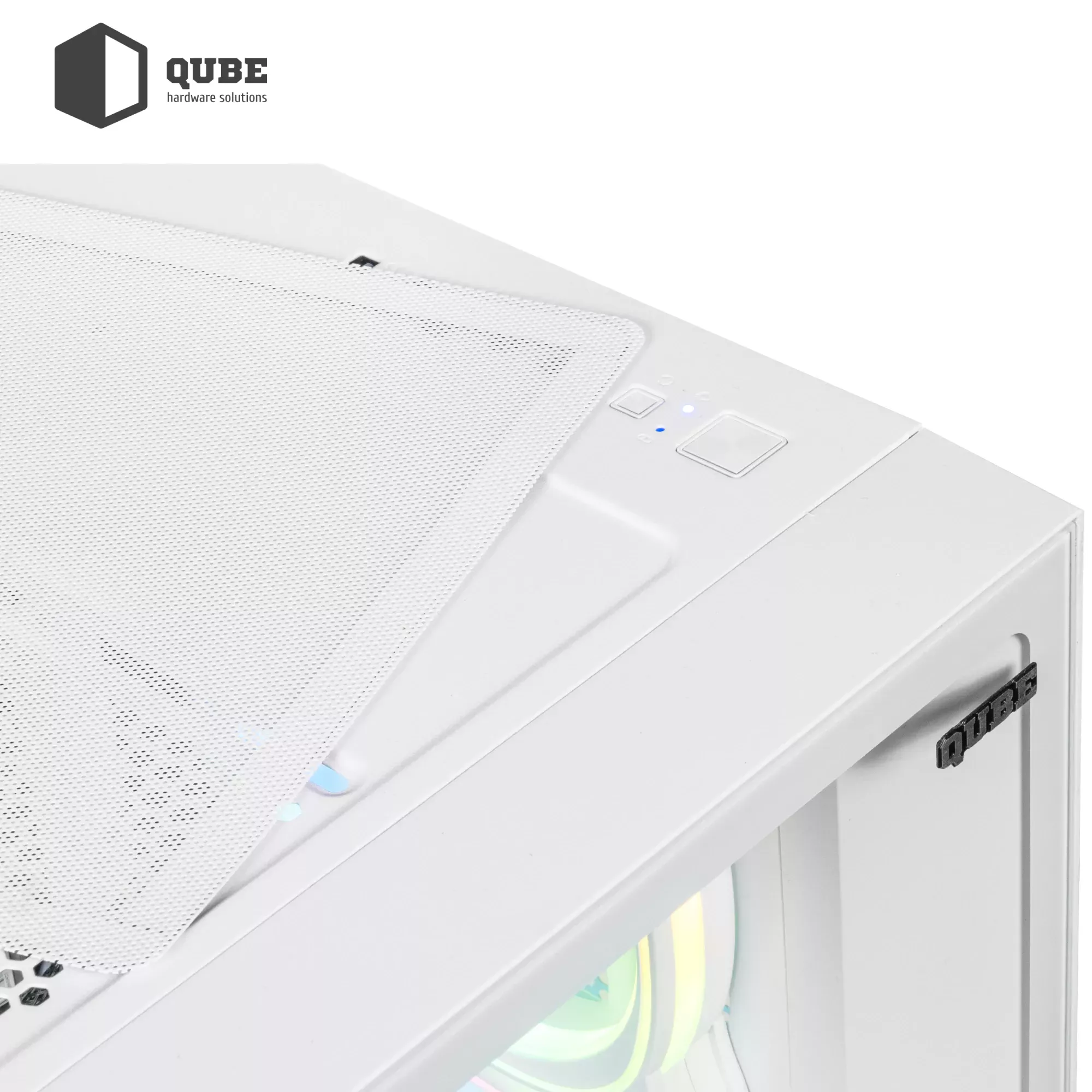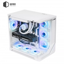 Корпус QUBE MIRAGE White сочетает в себе закалённое стекло толщиной 4 мм, современный минималистичный дизайн и мощную вентиляционную систему: 10 RGB-вентиляторов размещены на всех ключевых направлениях воздушных потоков. Такое решение создаёт эффектное визуальное сопровождение и поддерживает оптимальный температурный режим компонентов даже при длительных игровых сессиях.